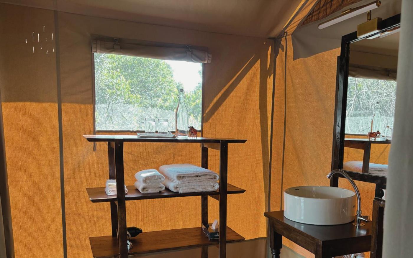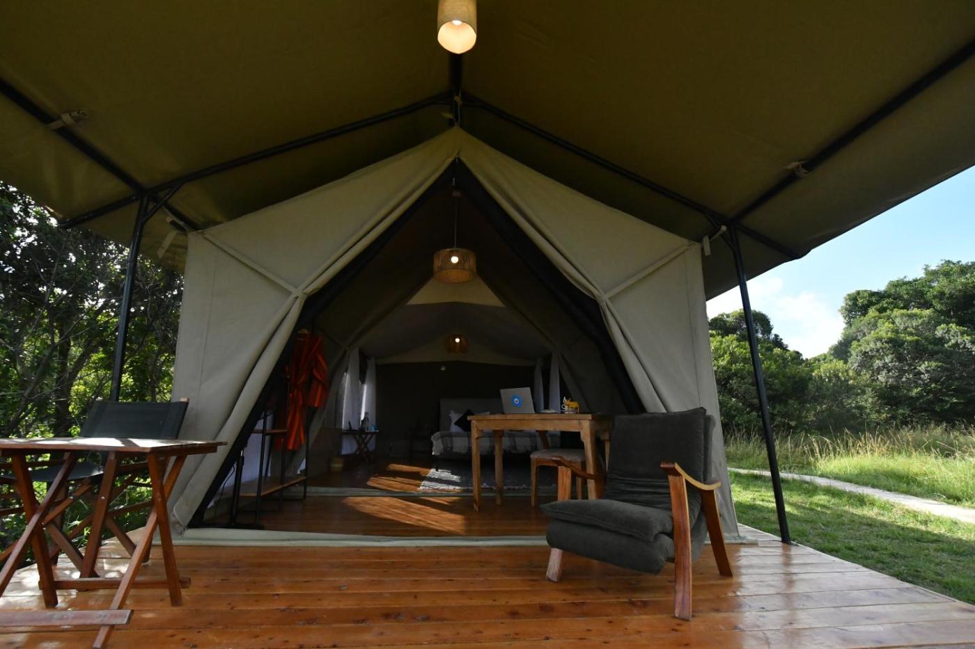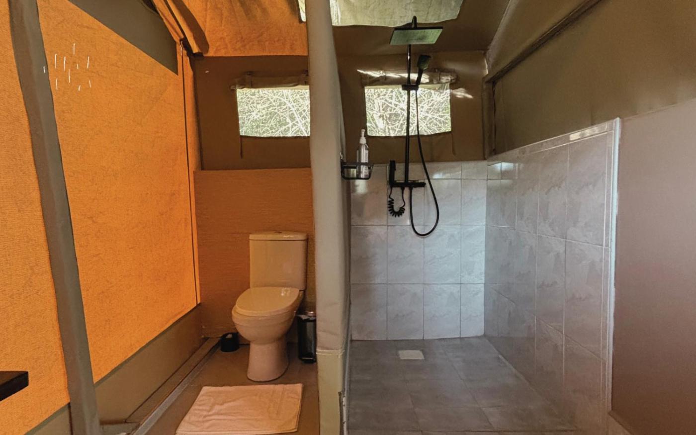 Tent. The tent includes a private bathroom fitted with a shower, a hairdryer and slippers. The tent is furnished with a desk and a seating area and features a dining area and an electric kettle. The unit has 1 bed. ;